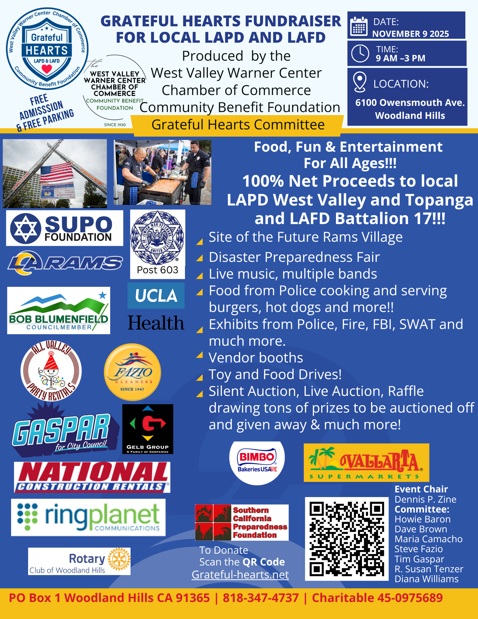 Join us at the GRATEFUL HEARTS Fundraiser for the local LAPD and LAFD, on Sunday, November 9 from 9AM to 3PM, located at 6100 Owensmouth Ave., Woodland Hills. There will be lots to do for all ages including a disaster preparedness fair, live music, BBQ, vendor booths, a toy drive and silent action. Admission and parking is free. 100% of the net proceeds go to the local LAPD West Valley and the Topanga stations, and LAFD Battalion 17.